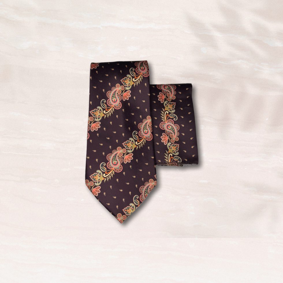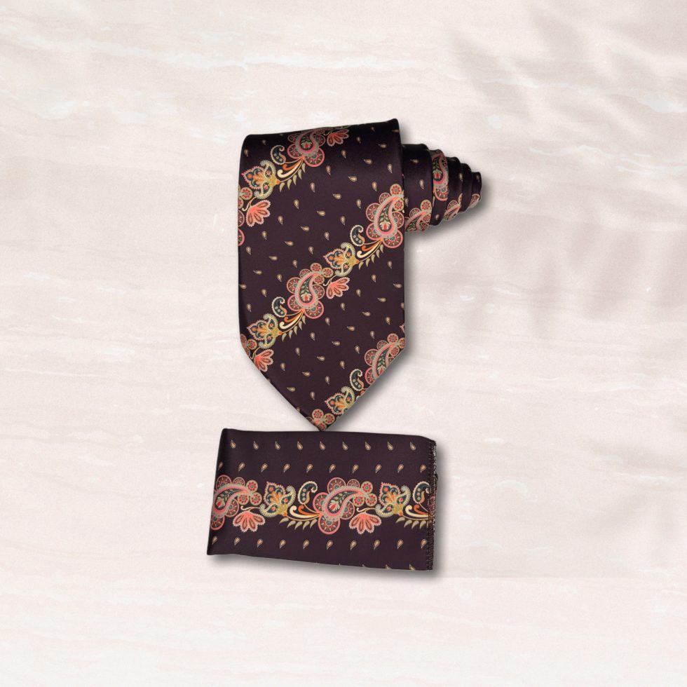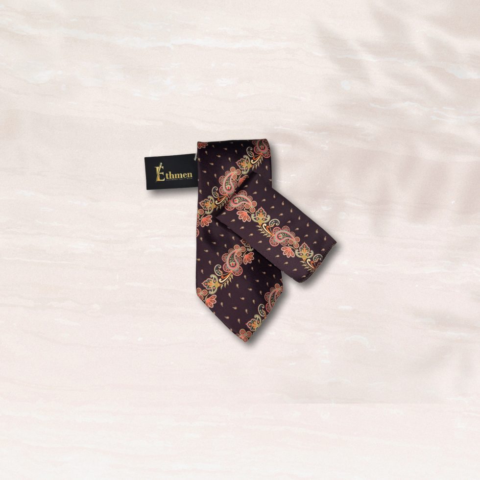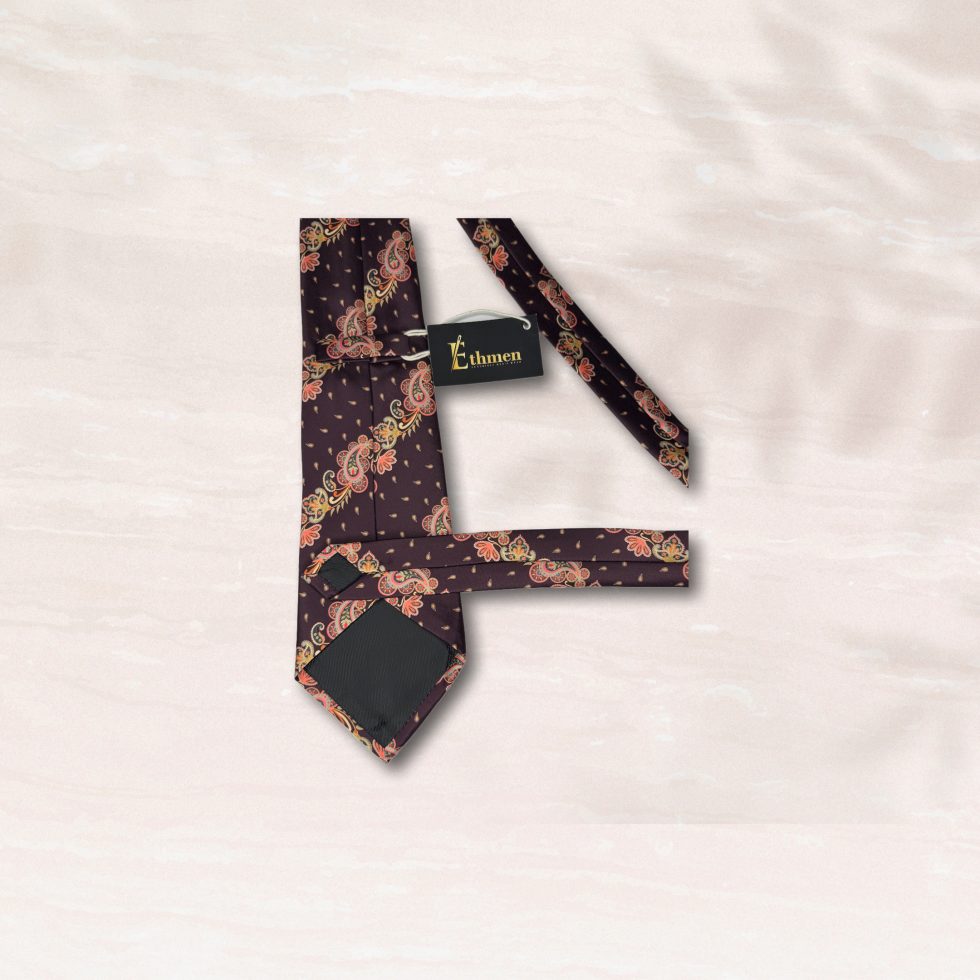 Infuse your style with the warm, rich tones of the season with the Ethmen ‘Autumn Equinox’ Tie and Pocket Square Set. This luxurious duo features a deep, chocolate-brown background, beautifully accented by a sophisticated paisley pattern in shades of fiery orange, soft gold, and dusky pink. The design captures the essence of autumn, offering a perfect blend of classic elegance and seasonal flair.