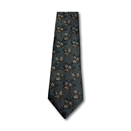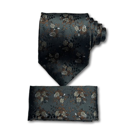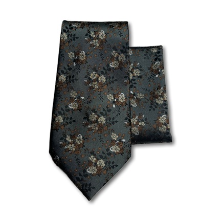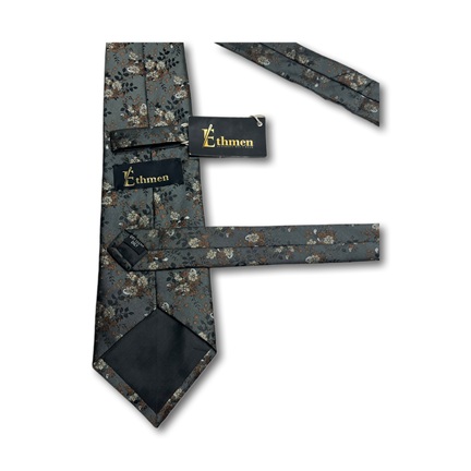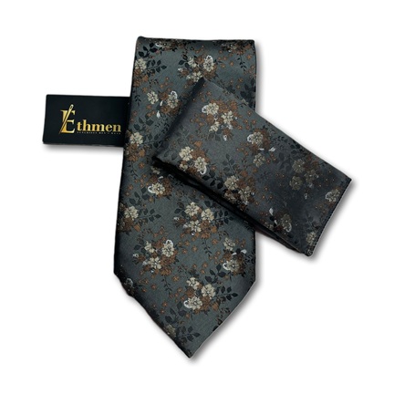 A modern Ethmen tie and pocket square set featuring a stylish floral pattern on a deep charcoal grey background. Accented with muted cream and brown colors, this set comes in a wooden gift box, offering a contemporary and sophisticated accessory for any formal event.