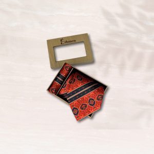 This refined Ethmen accessory set, presented in the brand’s classic wooden gift box, includes a matching necktie and pocket square designed for formal elegance. The set features a subtle yet intricate paisley pattern against a deep black or charcoal grey background. The paisley shapes are rendered in a low-contrast light grey or silver, giving the fabric a distinguished, textured appearance without being overly flashy. Crafted from a high-quality woven material, this timeless color and pattern combination is perfect for polished business attire or somber formal occasions where sophistication and restraint are key.