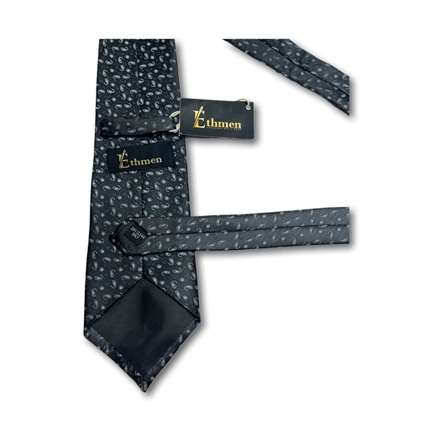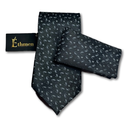 A classic Ethmen tie and pocket square set in black or charcoal grey featuring a subtle, low-contrast silver paisley pattern. Packaged in a wooden gift box, this set offers a sophisticated and formal accessory choice.
