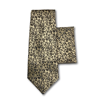 A premium men’s accessory gift set featuring a coordinated gold/beige tie and a matching pocket square, both patterned with a detailed dark floral design, presented in a sophisticated windowed gift box.