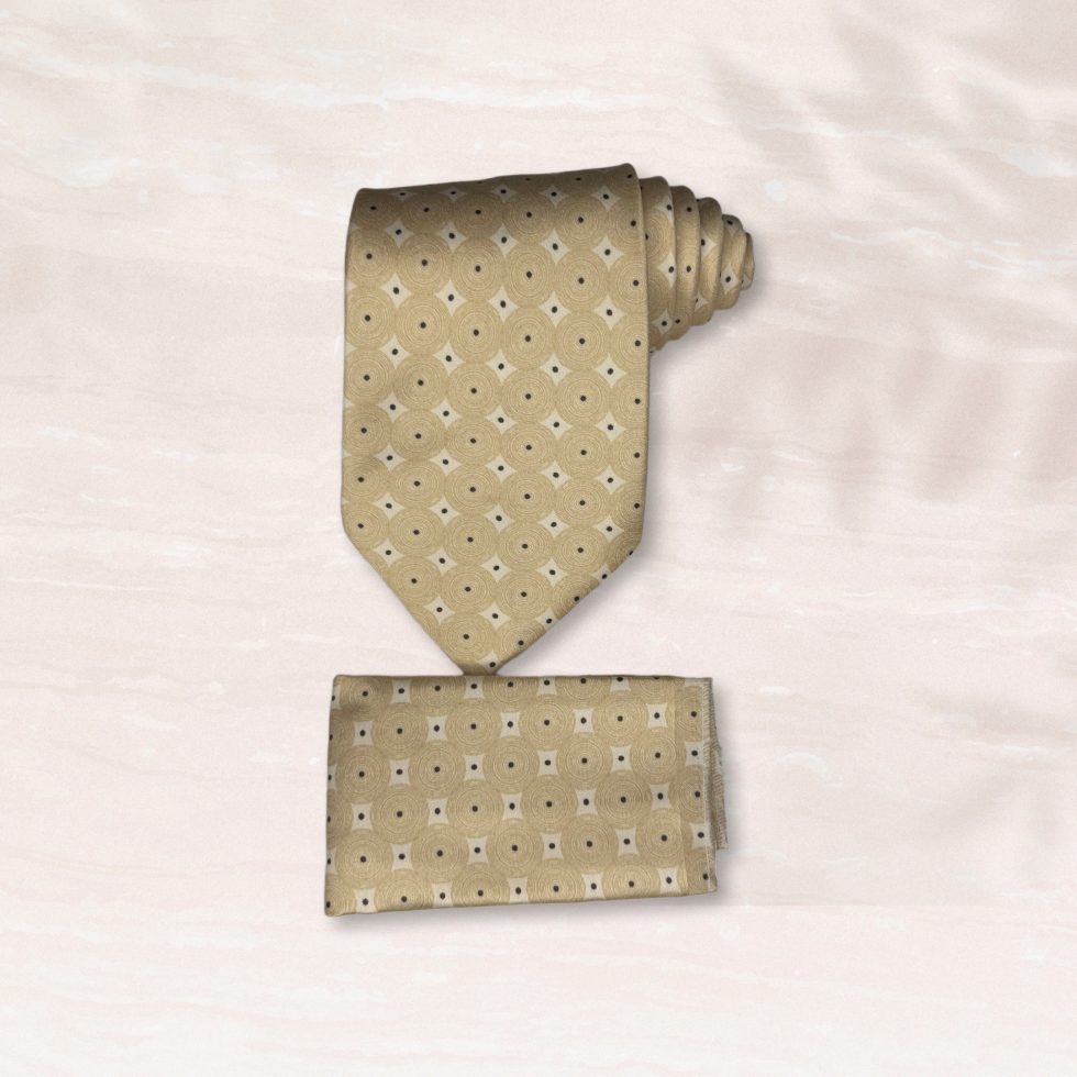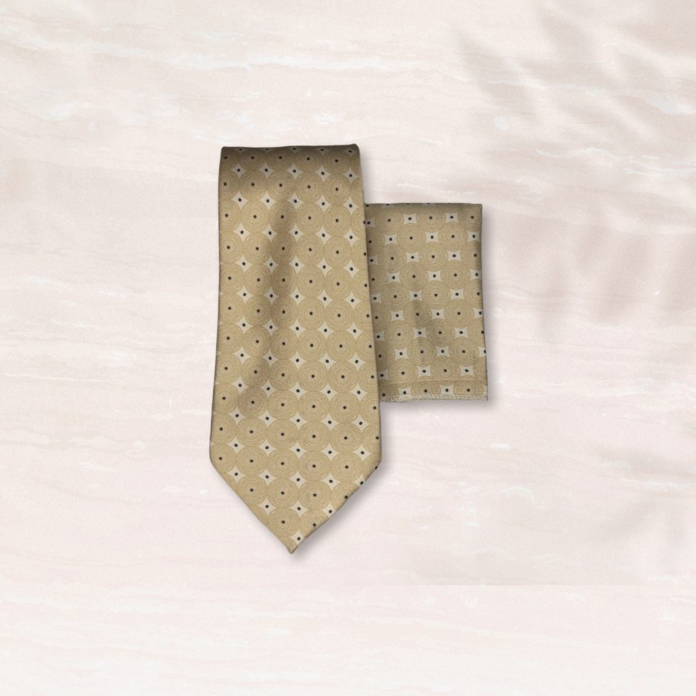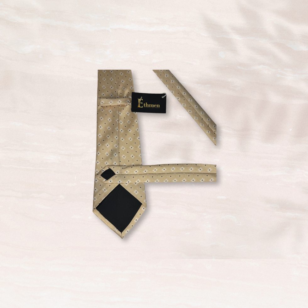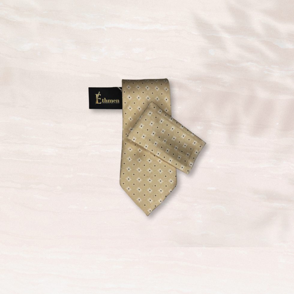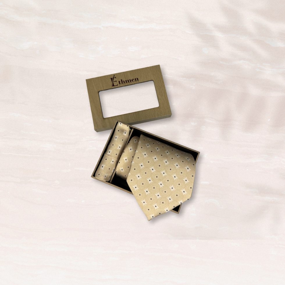 This Éthmen Golden Geometric Silk Feel Tie & Pocket Square Set is a perfect blend of modern style and classic elegance. The luxurious silk feel tie and matching pocket square feature a subtle, repeating geometric pattern on a rich golden background, creating a sophisticated and textured look. Presented in a beautiful wooden gift box with a transparent lid, this set is a superb gift for any discerning gentleman. It’s an ideal accessory for special occasions, adding a touch of refined charm to a suit or tuxedo.