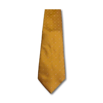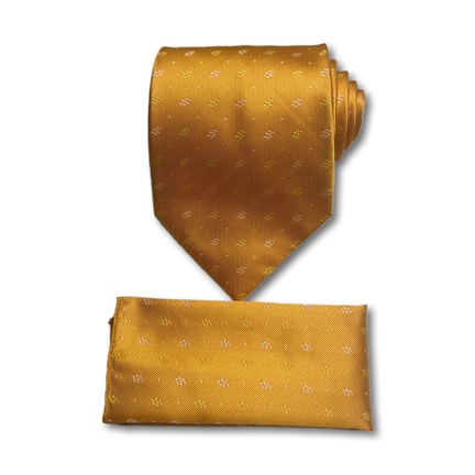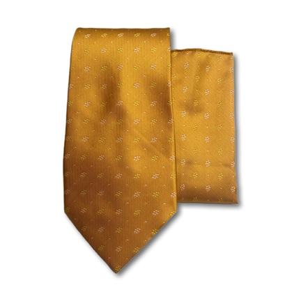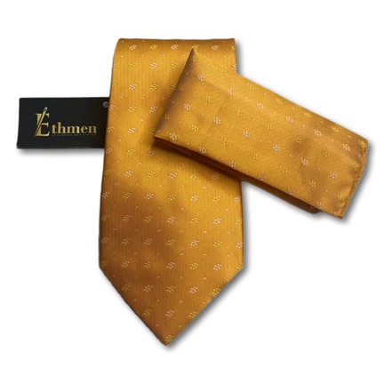 This is a rich and vibrant Ethmen accessories gift set featuring a necktie and a coordinating pocket square, presented in a wooden window box. Both items are crafted from a lustrous, silky fabric in a striking gold or mustard yellow color. The fabric has a subtle sheen and is patterned with a repeating micro-dot or small floral motif in a contrasting lighter color, such as cream or pale gold. The uniform, delicate pattern provides texture and depth without being overly busy. This bold yet sophisticated set is perfect for adding warmth and color to formal wear or as a distinguished accessory for special occasions.