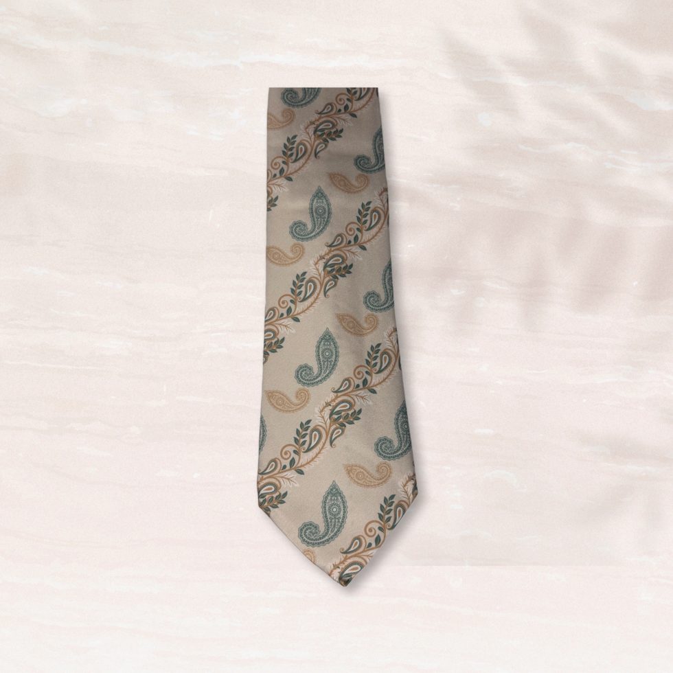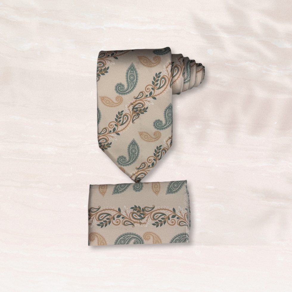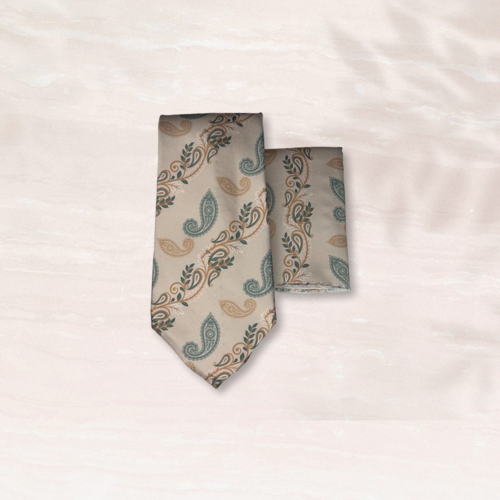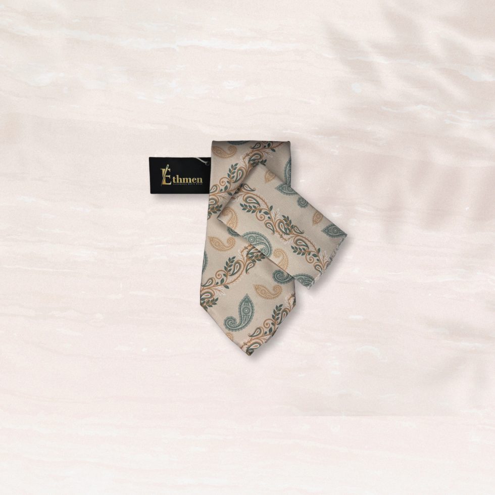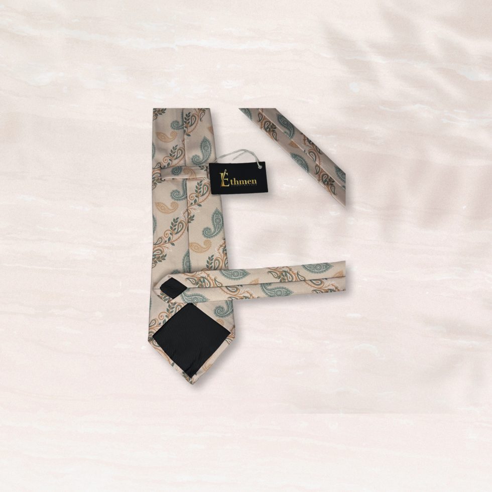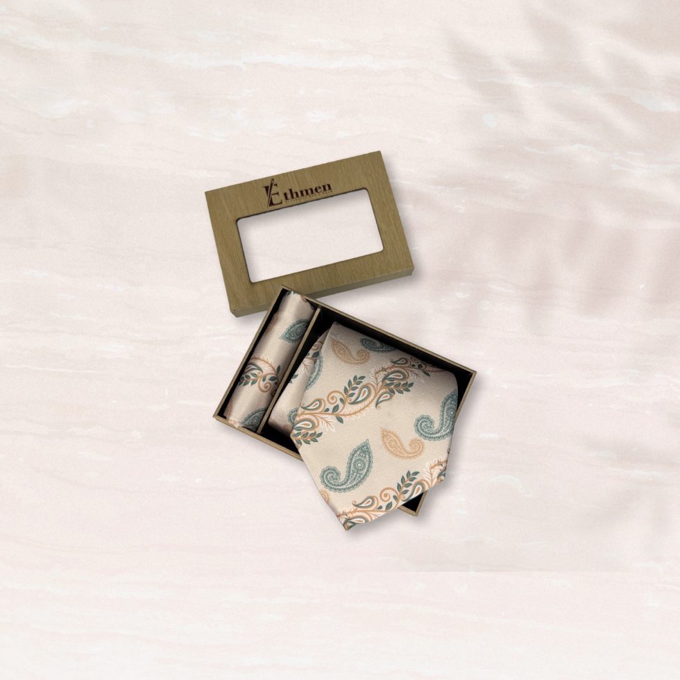 An elegant Éthmen men’s tie and pocket square set featuring a sophisticated paisley pattern in shades of teal, bronze, and cream. The set comes beautifully presented in a wooden gift box with a transparent top.