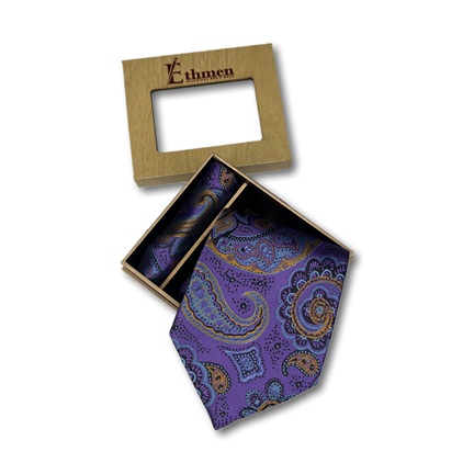 This is a regal Ethmen Tie and Pocket Square Gift Set featuring a deep royal purple silk-feel tie and a matching pocket square, both adorned with an intricate paisley pattern accented with gold and blue details. The set is presented in an elegant wooden window box, ideal for gifting.