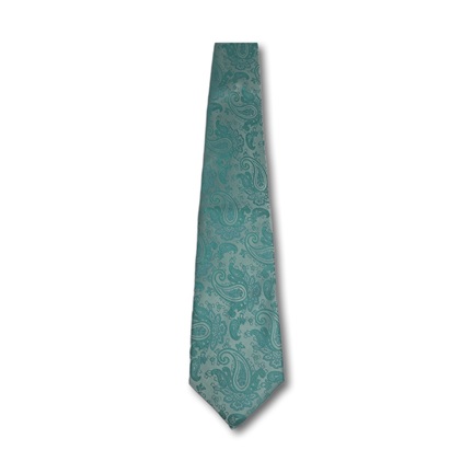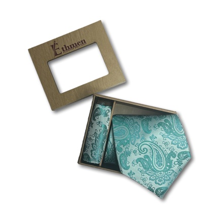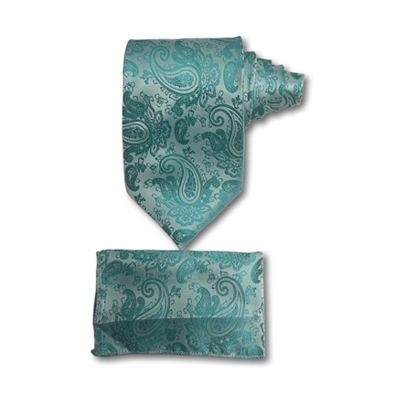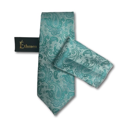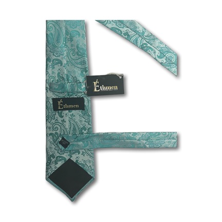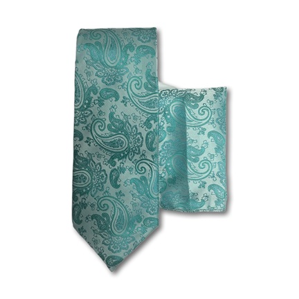 A vibrant men’s accessory gift set featuring a coordinated turquoise/teal tie and a matching pocket square, both detailed with an elegant, self-woven Paisley pattern, presented in a premium windowed gift box.