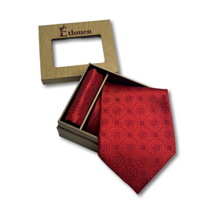 This is an elegant Lihmen tie and pocket square gift set in a rich burgundy color, featuring a subtly woven geometric or medallion pattern. Presented in a high-quality, branded wood-finish box, this coordinated set is a sophisticated choice for formal attire and an ideal gift.