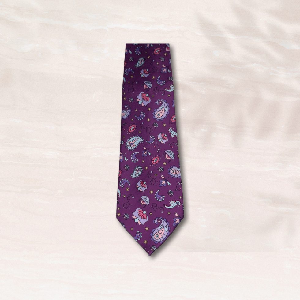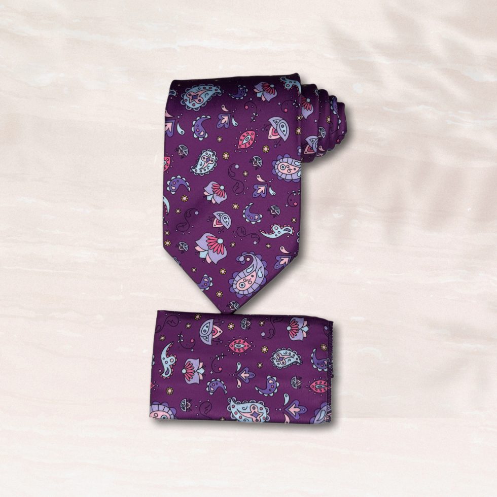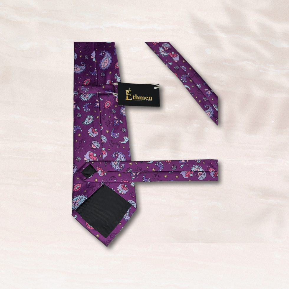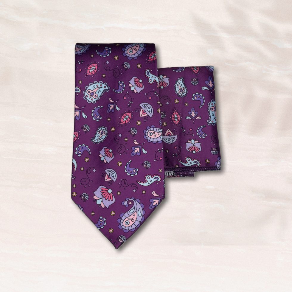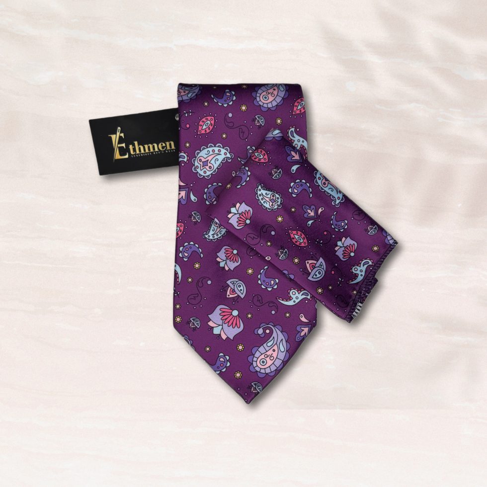 Elevate your formal and semi-formal looks with the Majestic Paisley Tie & Pocket Square Set. This striking two-piece collection features a rich, deep purple background adorned with a vibrant and intricate paisley pattern. The unique design, with its detailed floral motifs and whimsical accents in shades of light blue, magenta, and silver, adds a touch of artistic flair to a classic accessory.
