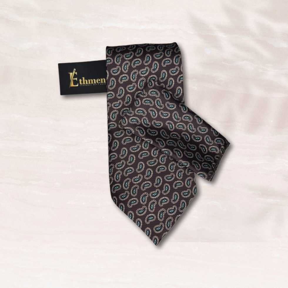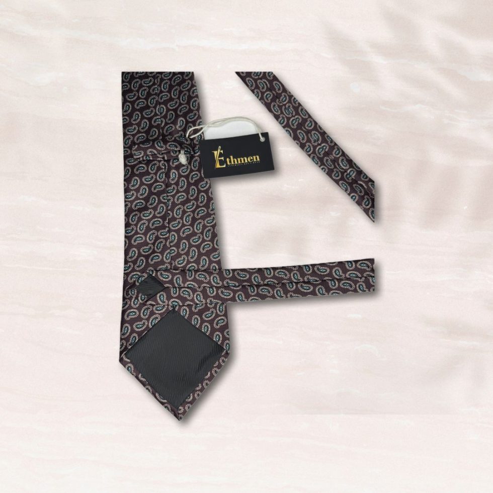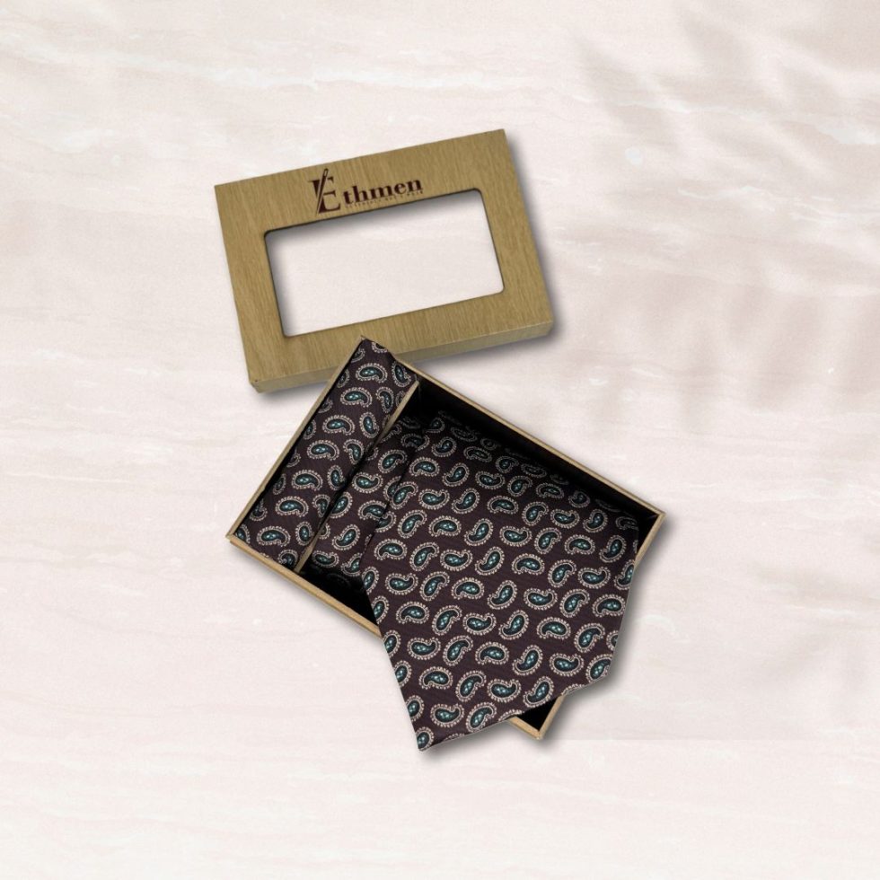 This elegant tie and pocket square set features a timeless paisley pattern on a deep, sophisticated dark brown background. The intricate design is highlighted by contrasting details in a striking turquoise and subtle off-white, creating a rich and versatile look. Made with high-quality fabric, this set is neatly packaged in a handsome wooden gift box with the Ethmen logo, making it a perfect present for any special occasion. Whether you’re dressing up for a formal event or adding a touch of flair to your business attire, this set will ensure you make a statement with style and confidence.