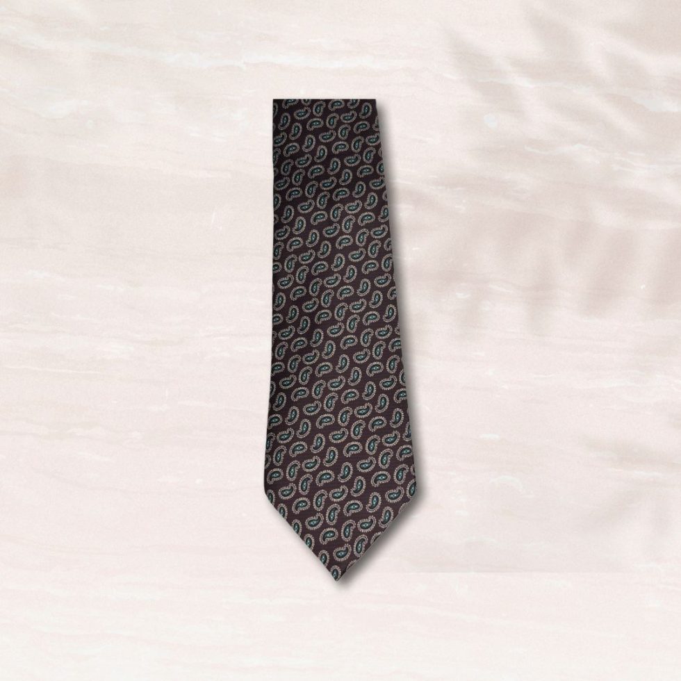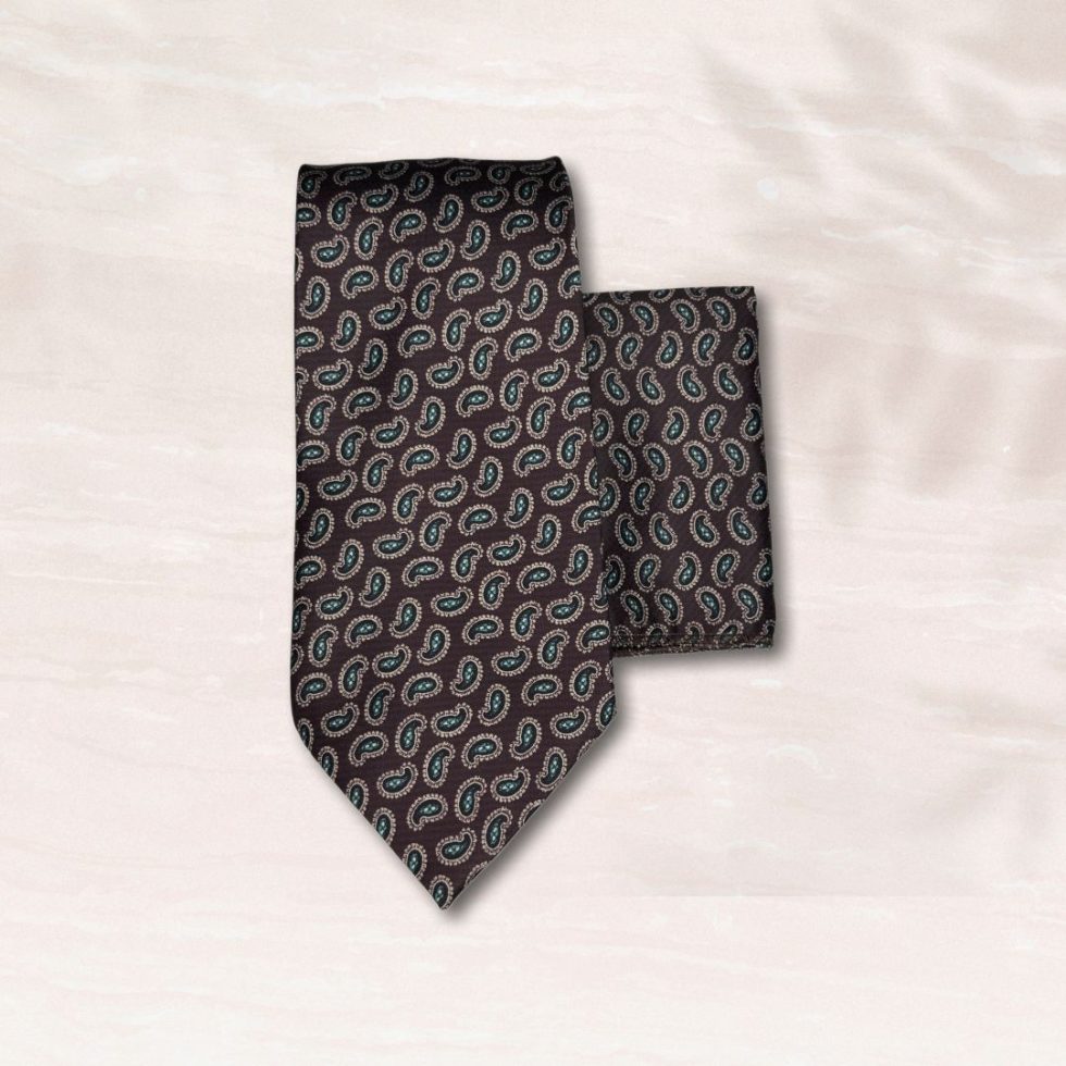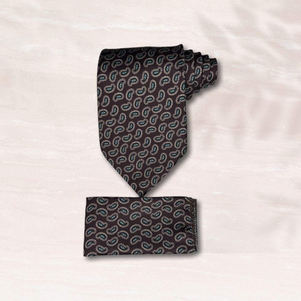 Elevate your formal look with this beautiful tie and pocket square set. It features a classic paisley pattern on a deep, dark brown background with striking turquoise accents. Packaged in a stylish wooden box, this set is perfect for gifting or adding a touch of sophisticated flair to your own collection.